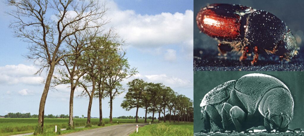 Dutch elm disease (DED) devastated elms on an incredible scale. Breeding for resistance has resulted in a number of varieties with robust resistance, but for existing trees protection is difficult. Sanitation in combination with the biological control developed by my university group in the 1980s can limit losses of often valuable trees, for infection through beetle transmission to 0.1% annually as has been proven in 25+ years experience.